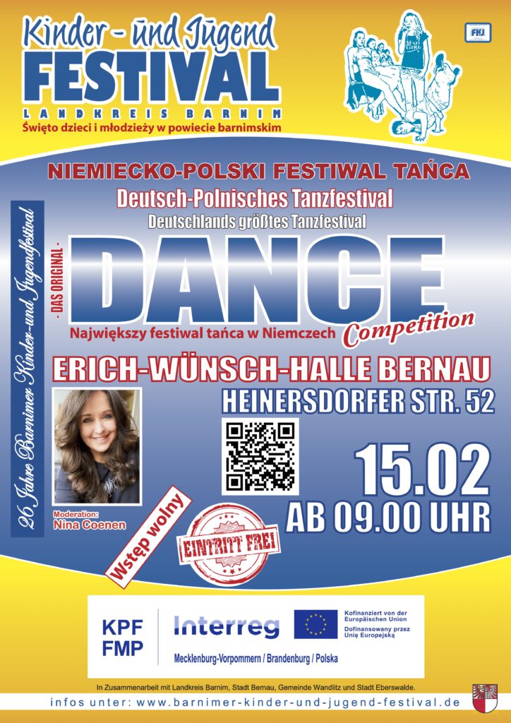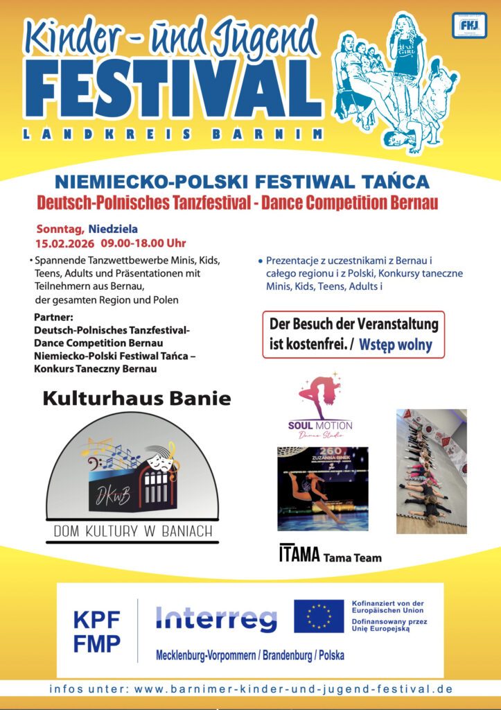 Am Sonntag,15.02.2026 erwartet Dich das Deutsch-Polnische Tanzfestival. Talentierte Tänzer aus Bernau, aus dem Landkreis Barnim, Stettin und Banie, was sie drauf haben. Los geht es am Sonntag ab 09.00 Uhr. Neben einzigartigen Showdance-Einlagen werden beeindruckende Beiträge verschiedener Stilrichtungen präsentiert.